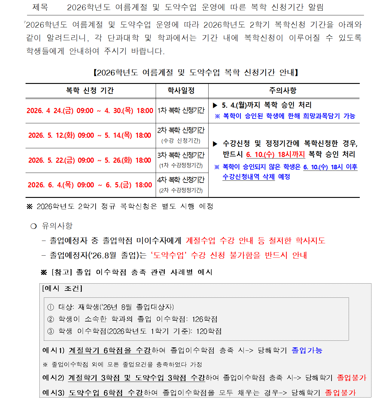 2026 여름계절학기 수강을 위한 복학신청기간 안내