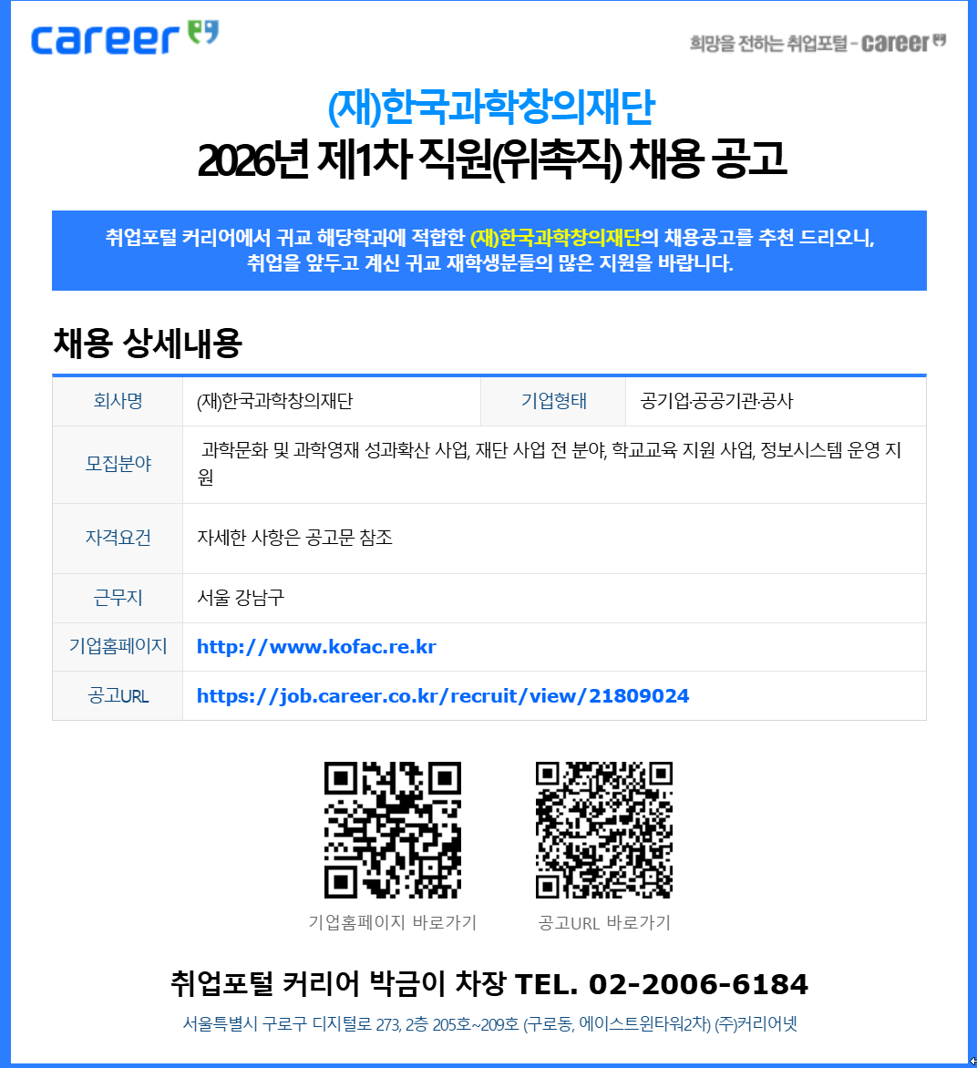 (재)한국과학창의재단 2026년 제1차 직원(위촉직) 채용 공고
