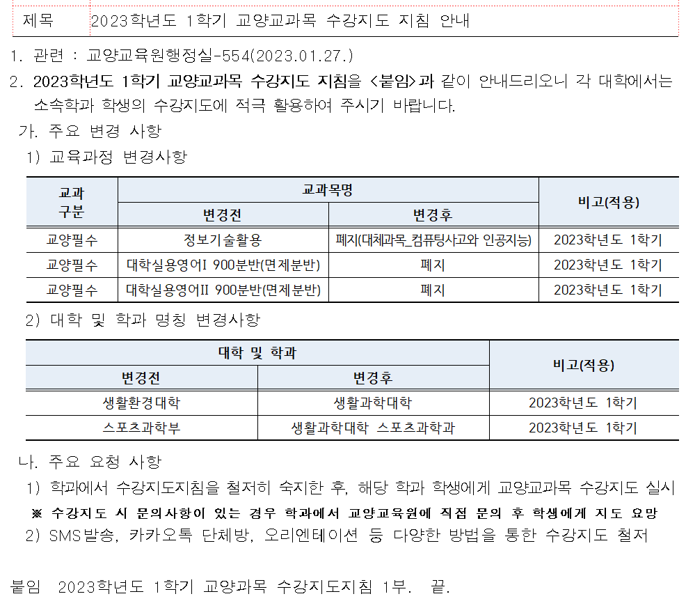 2023학년도 1학기 교양교과목 수강지도 지침 안내