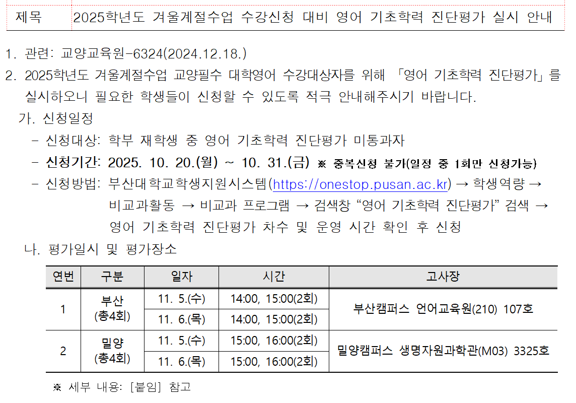 2025학년도 겨울계절수업 수강신청 대비 영어 기초학력 진단평가 실시 안내