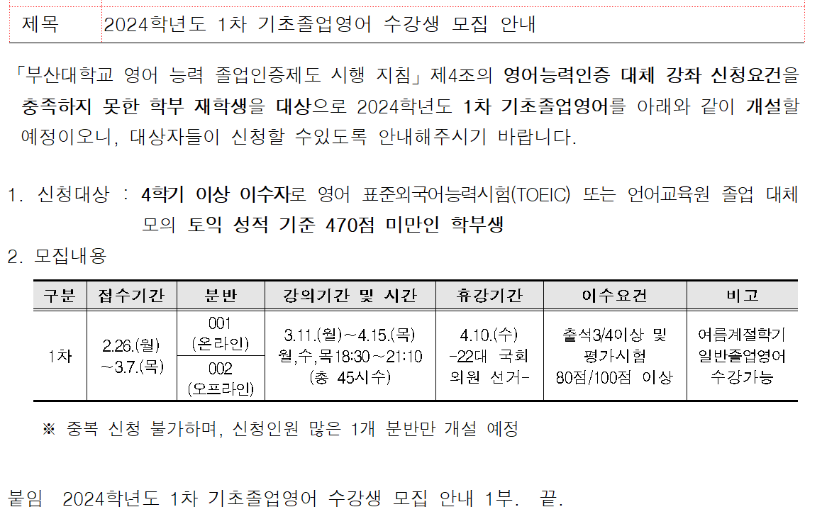 2024학년도 1차 기초졸업영어 수강생 모집 안내(재학생)