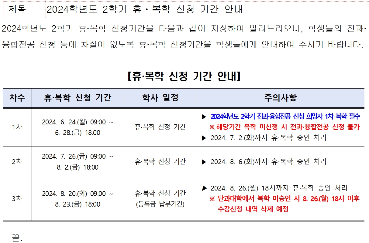 2024학년도 2학기 휴ㆍ복학 신청 기간 안내