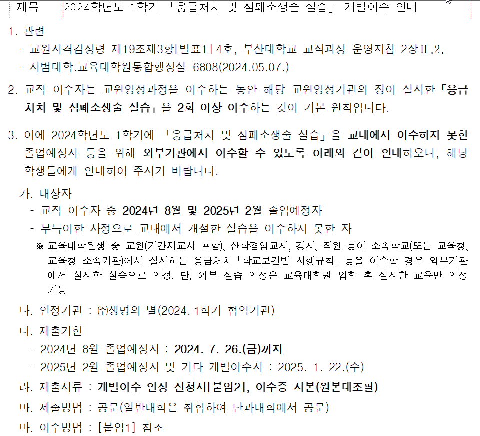 2024학년도 1학기 「응급처치 및 심폐소생술 실습」 개별이수 안내