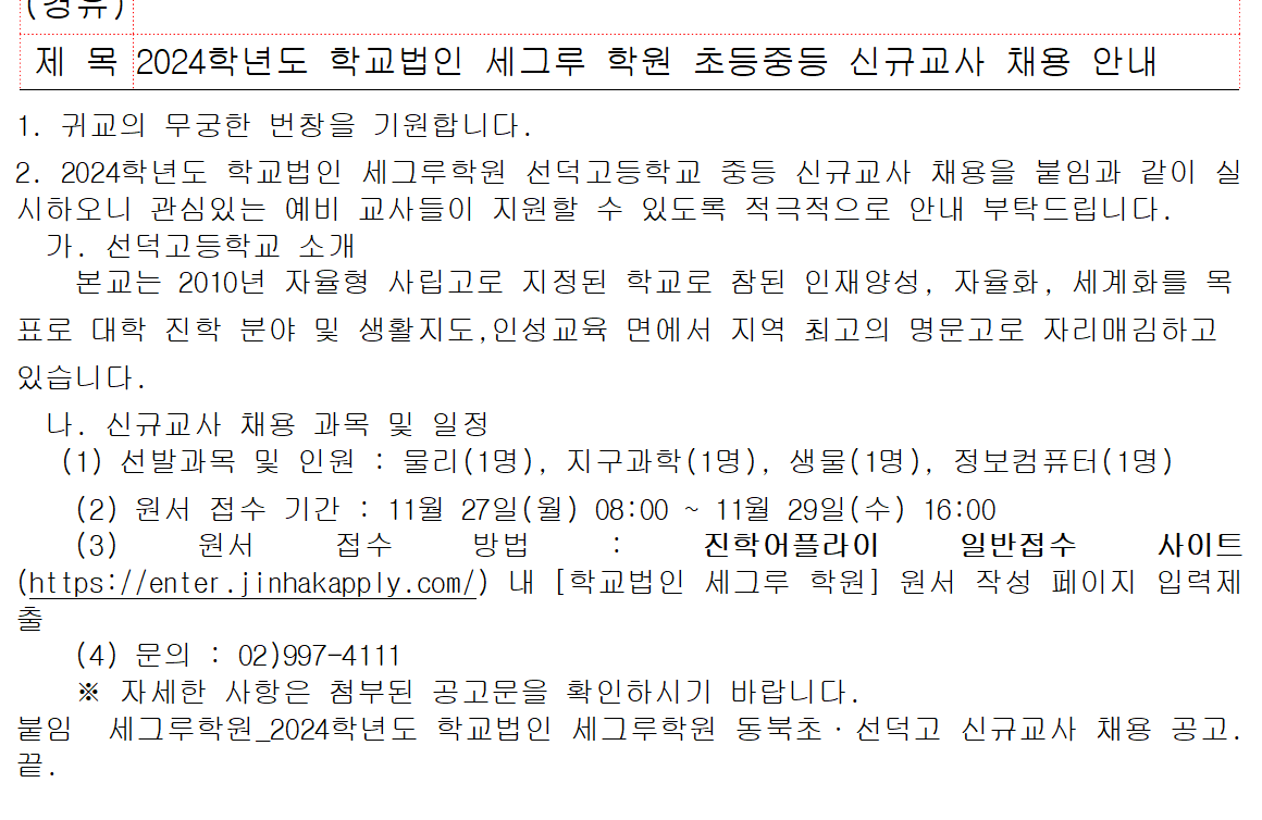 fnctId=bbs,fnctNo=4690 작성일 2023.10.31 수정일 2023.10.31 작성자 최주희 조회수 203 2024학년도 학교법인 세그루학원 동북초·선덕고 신규교사 채용 공고 안내 첨부파일 세그루학원_2024학년도 학교법인 세그루학원 동북초·선덕고 신규교사 채용 공고.hwp 미리보기